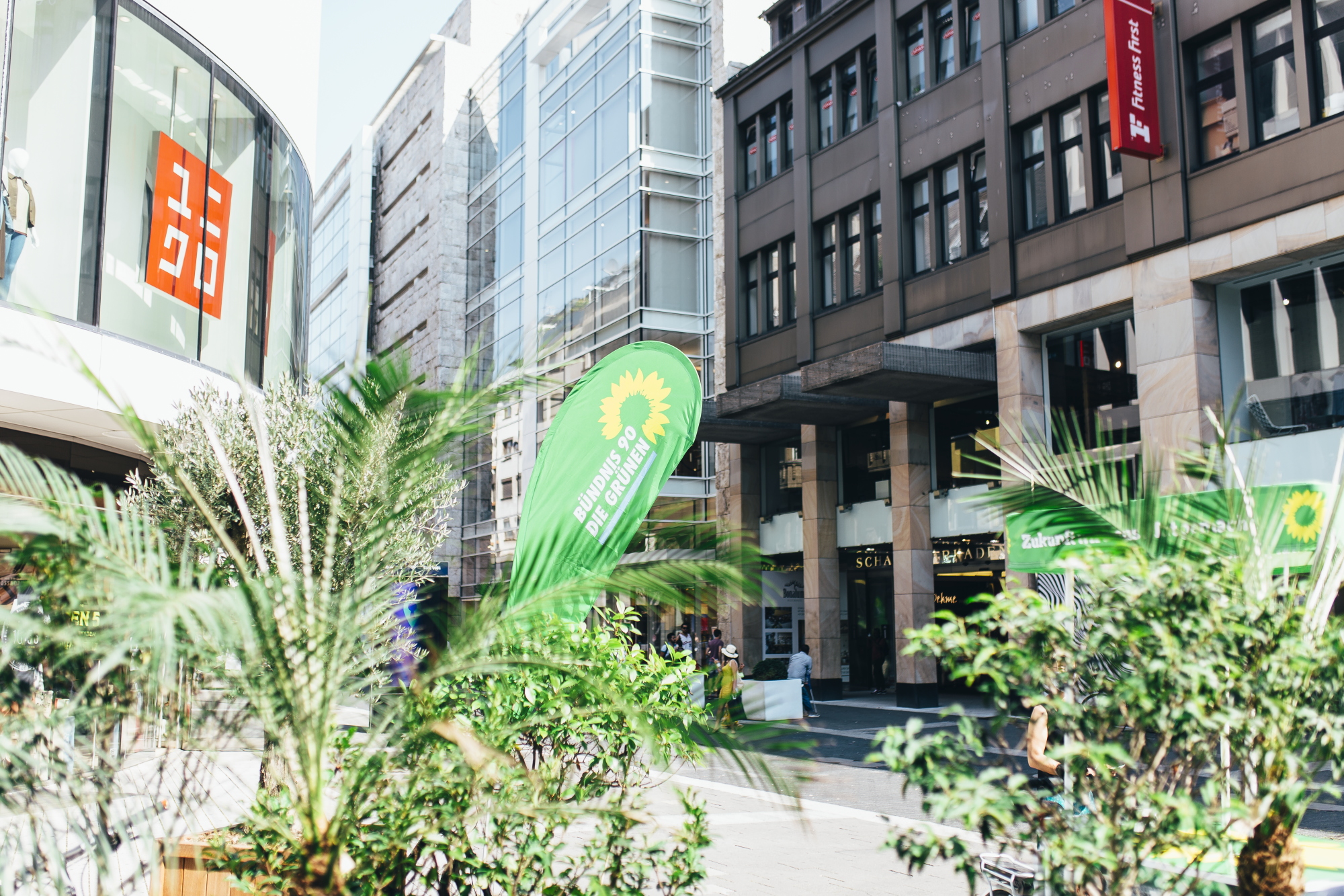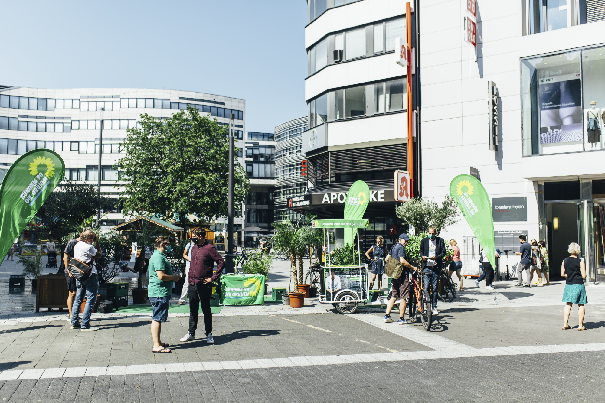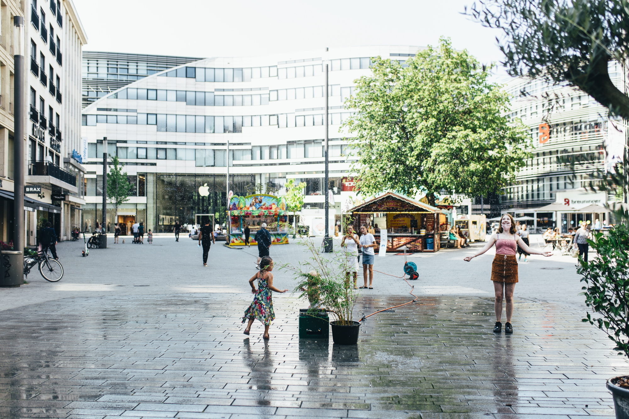 Mit Wassersprinklern und temporären Pflanzen haben die GRÜNEN Düsseldorf und ihr OB-Kandidat Stefan Engstfeld auf dem Schadowplatz gezeigt, wie man kurzfristig und temporär eine dringend benötigte Abkühlung auf den viel zu heißen, zubetonierten Plätzen in der Stadt schaffen kann.