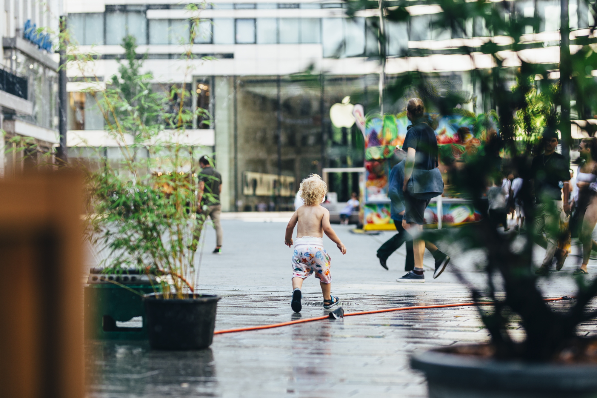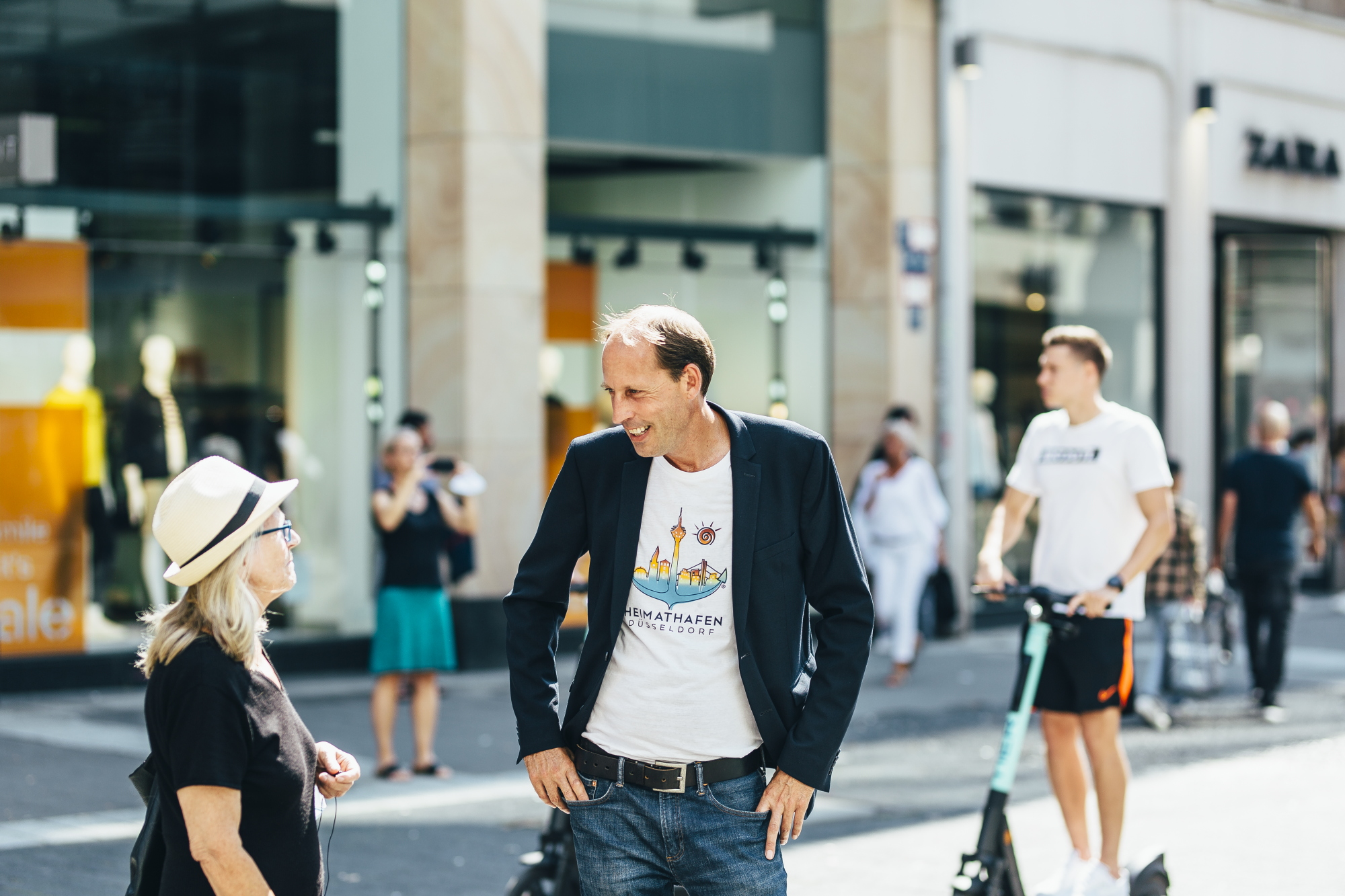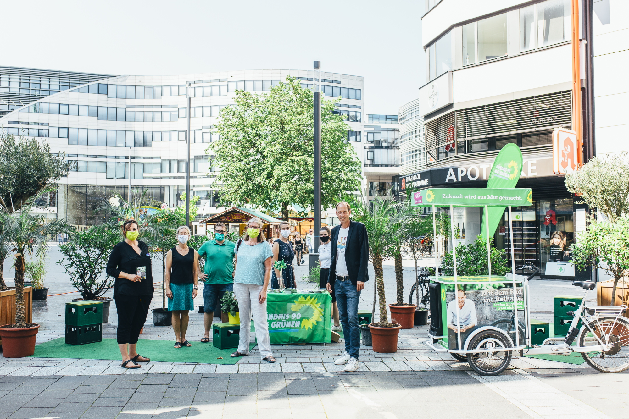 Mit Wassersprinklern und temporären Pflanzen haben die GRÜNEN Düsseldorf und ihr OB-Kandidat Stefan Engstfeld auf dem Schadowplatz gezeigt, wie man kurzfristig und temporär eine dringend benötigte Abkühlung auf den viel zu heißen, zubetonierten Plätzen in der Stadt schaffen kann.
